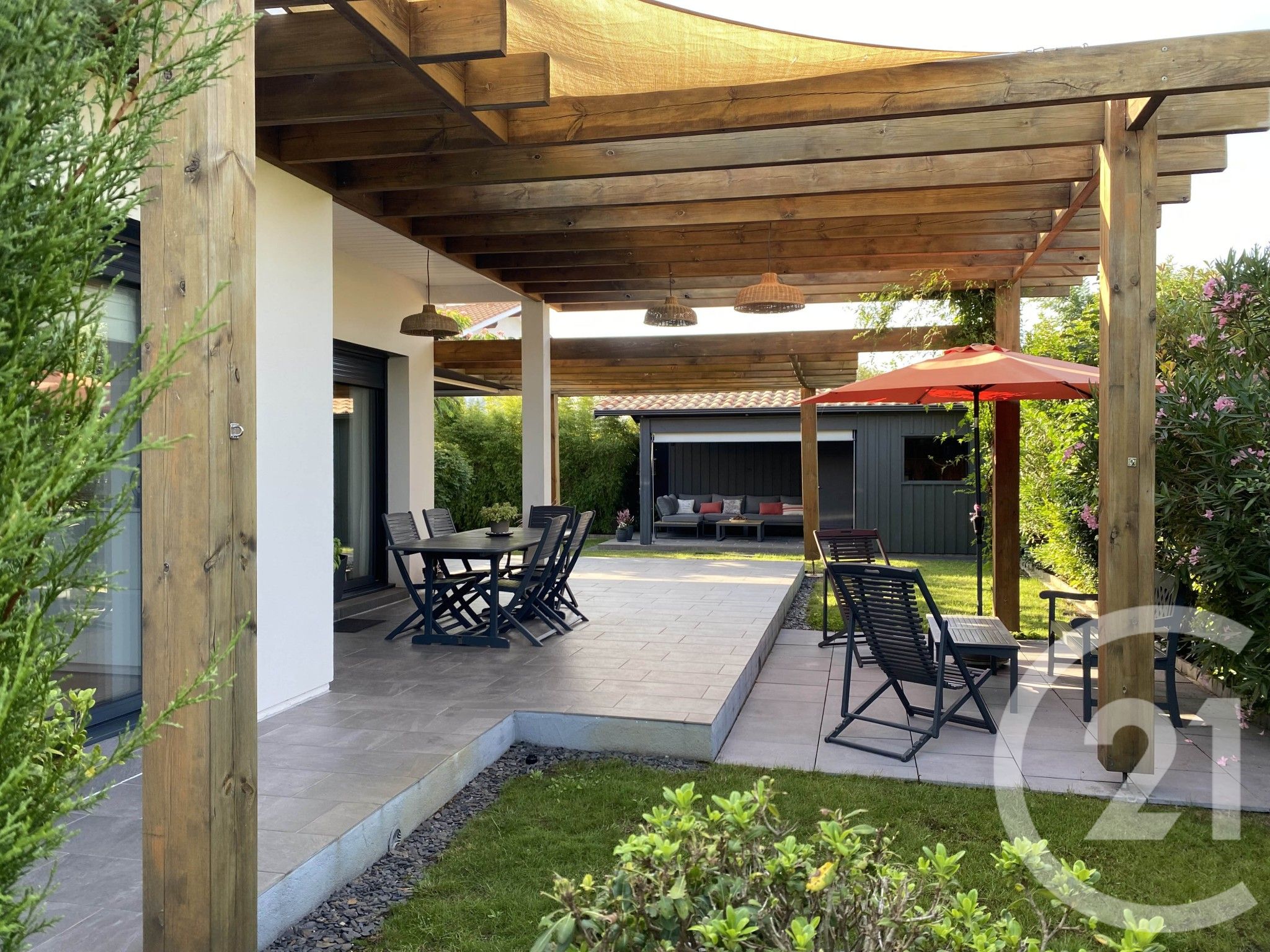 Implantée sur un terrain paysagé, la maison dispose d'une agréable terrasse et deux pergolas idéales pour profiter des beaux jours en toute intimité.